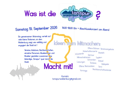 „Tonspur Waldenburg" bringt im Herbst 2026 Musik, Kreativität und Begegnung in die ganze Stadt. An vielen kleinen Stationen –können Bürgerinnen und Bürger Workshops, Mini Konzerte, Bastel oder Bewegungsaktionen anbieten oder einfach spontan mitmachen. Lokale Vereine, Nachbarschaften und Einzelpersonen gestalten den Tag gemeinsam und zeigen, wie vielfältig Waldenburg ist und auch klingt. Ein Abschlusskonzert rundet das Programm ab. Alle Waldenburgerinnen und Waldenburger sind eingeladen, selbst eine kleine Station beizutragen und Teil der „Tonspur" zu werden. Meldet euch einfach noch an. Das Tonspur-Orgateam bringt die Akteure zusammen, unterstützt euch wo Ihr noch Hilfe braucht oder vielleicht einen musikalischen Event für eure Location und übernimmt die Kommunikation für den Erlebnistag in den Medien. Kontakt: tonspurwaldenburg@gmail.com